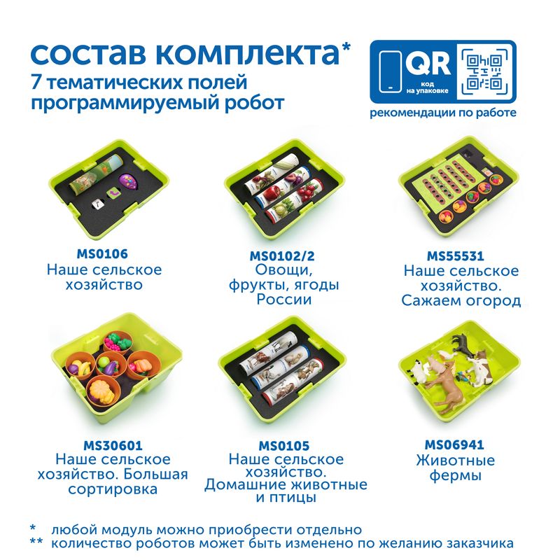 Этот уникальный комплект повышает престиж профессий агронома и фермера, воспитывает интерес к труду на земле, формирует знания о цепочке производства продуктов, развивает инженерное мышление через интерактивные задания