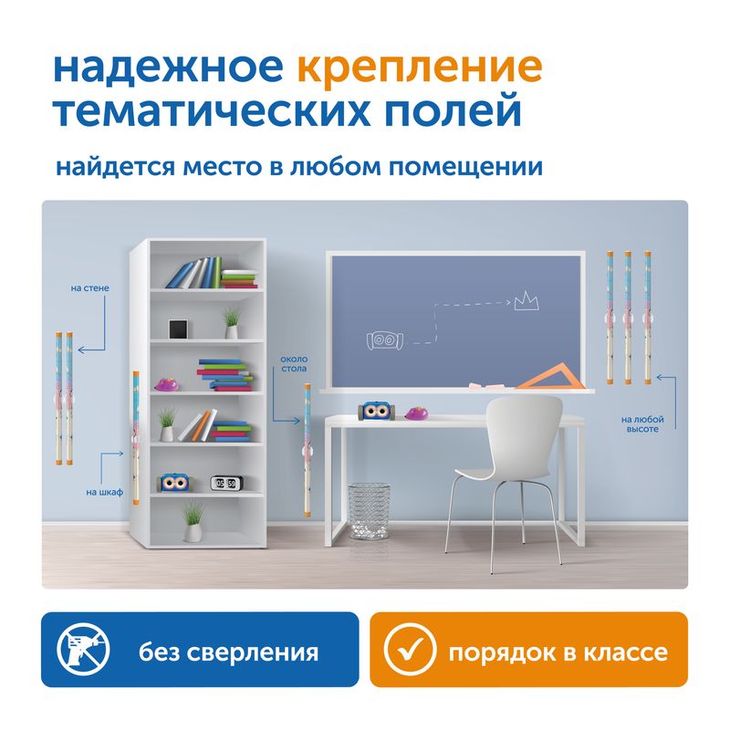 Наши тематические поля оснащены инновационной системой крепления. Вы можете легко разместить поля на любой поверхности: стене, шкафу, столе или мобильной стойке – без сверления и повреждений. Мгновенная установка, регулировка по высоте и надежная фиксация – теперь поддерживать порядок в учебной среде проще, чем когда-либо!