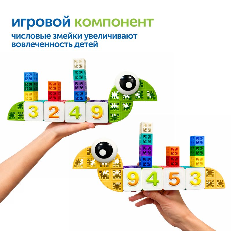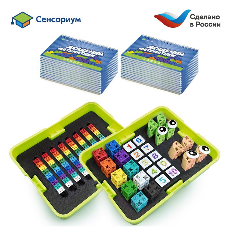 Основа комплекта — инновационные «Растущие кубики Сенсориум». Это первые кубики, соединяющиеся со всех 6 сторон, которые служат готовой дидактической системой для изучения арифметики.